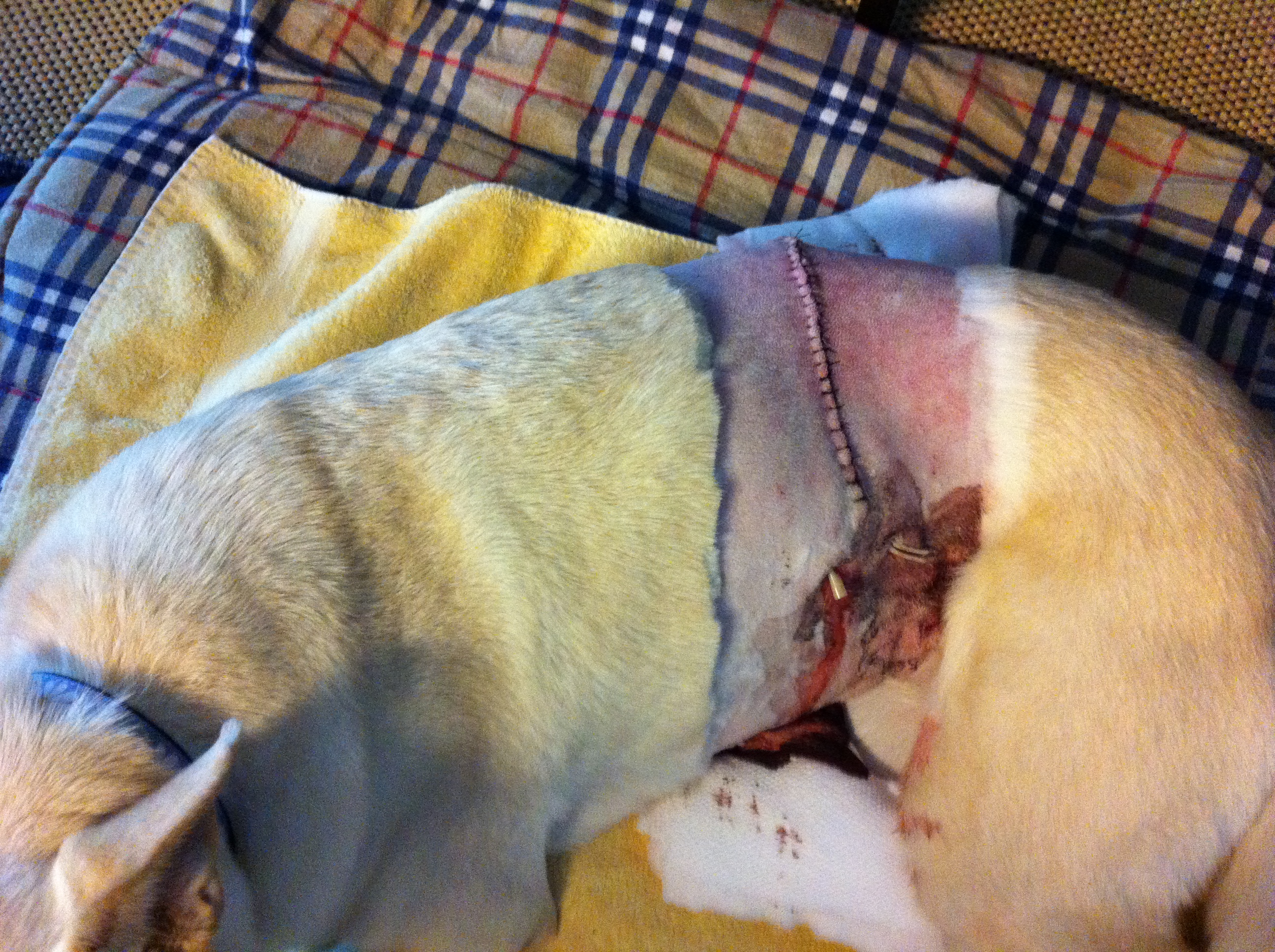 SAN DIEGO, CA – Saturday, January 14, 2012 – The Sash – never too far from drama – underwent surgery to remove a mysterious growth on her side. We were certain it was cancer, but turned out benign. If you have a strong stomach, check out the photo gallery to see her wound and the drains placed in her side. The drains were in for weeks and she actually pulled a drain out using her teeth on two occasions. She wore my old baseball T-shirts most of the time to help collect the oozing.