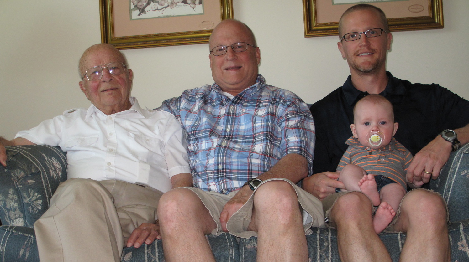 ST. LOUIS, MO – Saturday, June 23, 2012 – Four generations of Bach-men assembled for a historic family photo at Friendship Village residential community. The usually chipper Tristan was not in his playful mood (hence the pacifer) as he was bumping up against his eating schedule. And the photo required using the automated timer on the camera, but nonetheless we managed to capture a few images. More images will be posted soon.
