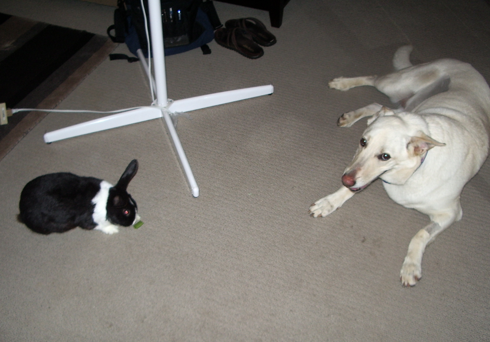 In January 2007 we adopted Sasha, our German Shepherd mix, and after learning there was nothing to fear from the Sash, the bunnies eventually accepted the dog as part of the family. Opie became quite “brave” and would poke Sasha with his nose as she slept.