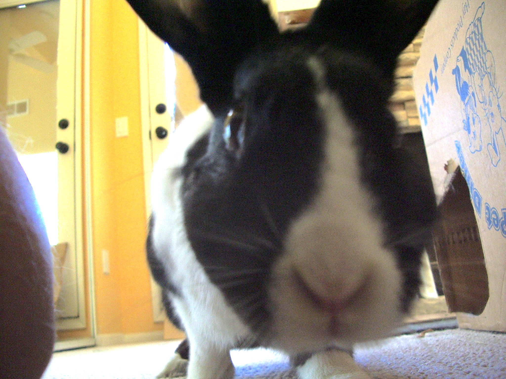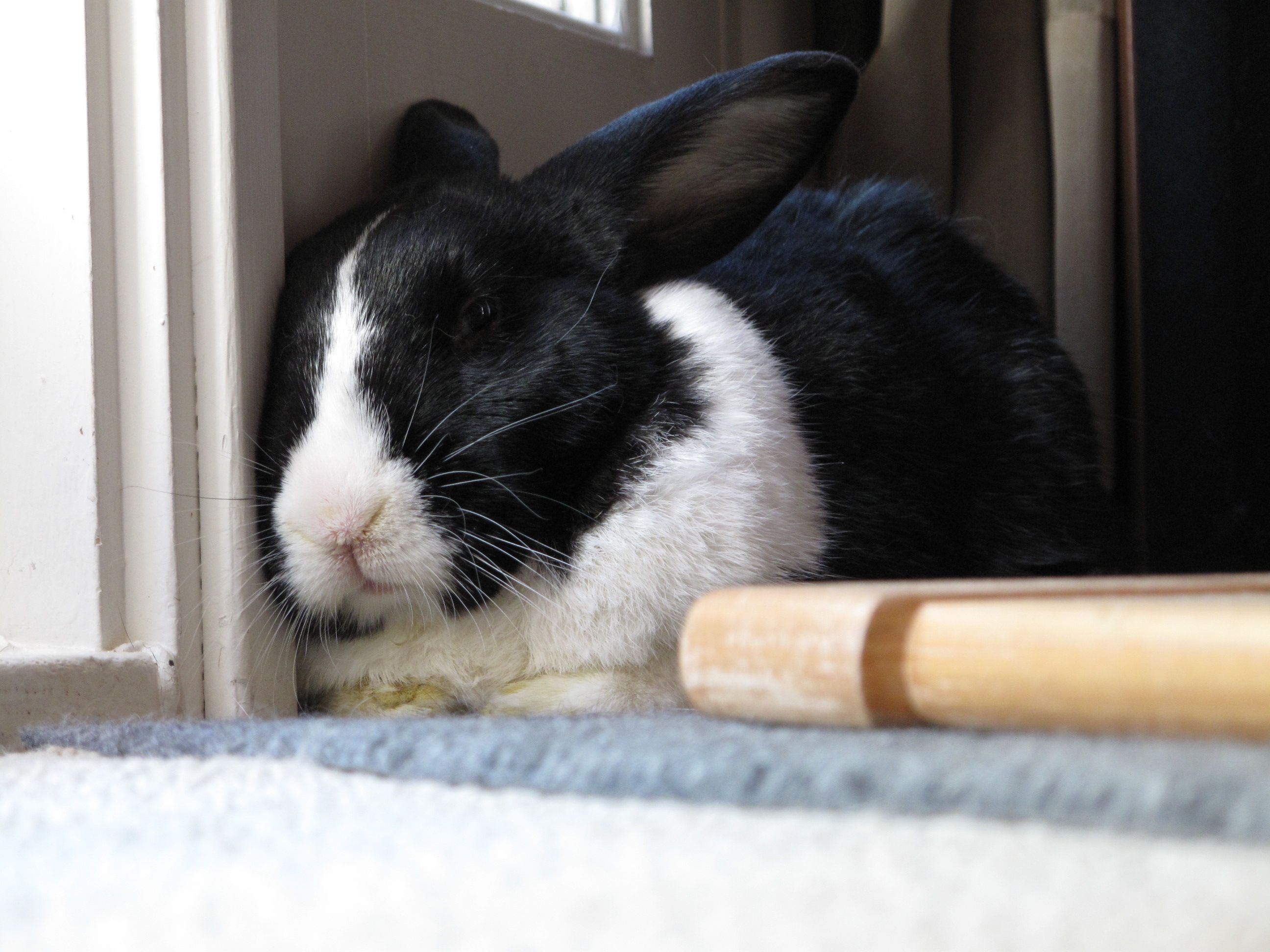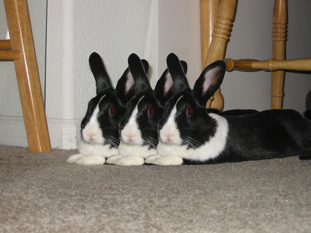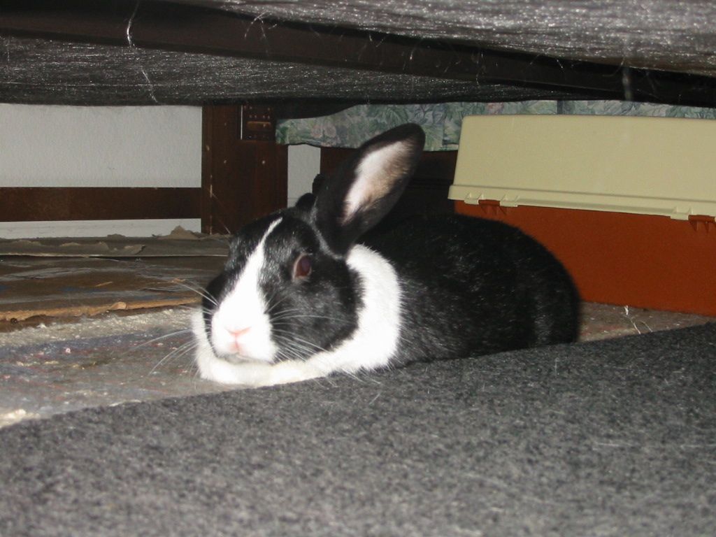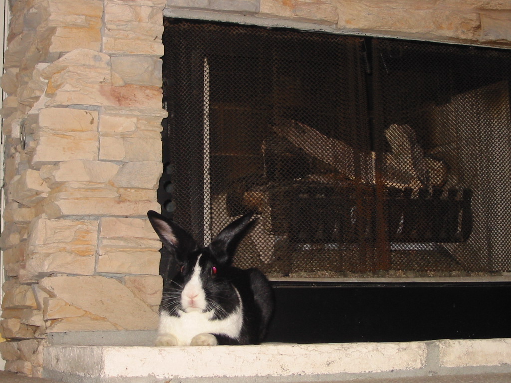 Optimus Prime Bachmann aka O.P. aka Opie aka The Douche aka Brat aka Snot Rabbit aka Black-n-White was adopted as a one-year old Dutch bunny from the Missouri House Rabbit Society in July of 2001. He was a one-year wedding anniversary present from Matt to Angela.