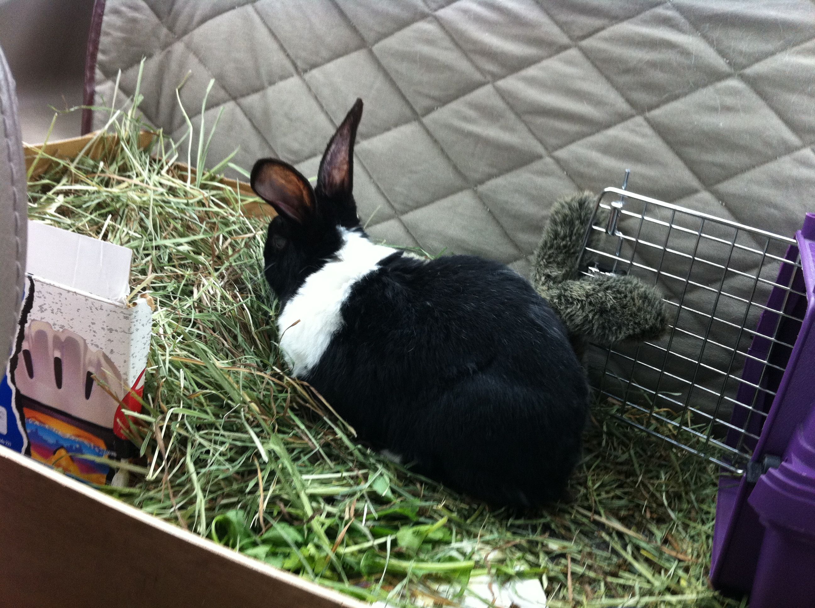In January 2012, Cali was put to sleep and Opie was clearly confused and lonely. We gave him two stuffed bunnies and he was found cuddling next to them and occasionally even grooming them. He was blind, but still moved throughout the house, slowly. In June 2012, Matt built him a platform that would fit in the backseat of a car to make it easier for him to travel. He was loaded into the same Honda Accord in which he arrived in San Diego 10 years ago, making the reverse trip back to his hometown of St. Louis. He lived 6 comfortable and calm months with the Hughes in Manchester, MO – the logistics of him continuing on to New York with us too great. Susan and Emily provided excellent care and attention to a rabbit that definitely deserved it.
