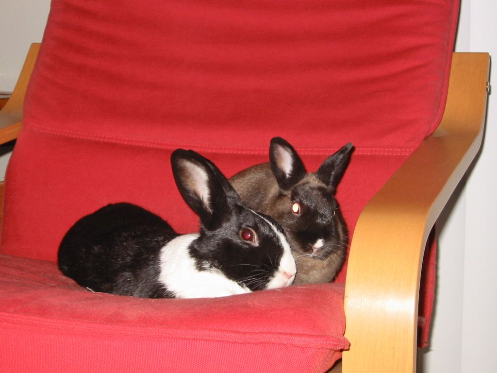 Opie lived his early years roaming our new apartment in Kirkwood, MO, napping underneath our glass-and-wood coffee table and developing an affinity for “snacks” (wheat thins and licorice). In June 2002, he made the trek to California with us, “surfing” with paws splayed out on the backseat of Angela’s Honda Accord. A few months after moving to San Diego, we adopted a small, female dutch-dwarf mix bunny that we named California (Cali). A strong, life-long bond developed between Opie and Cali. They would be frequently found together, side by side, in our IKEA chair.