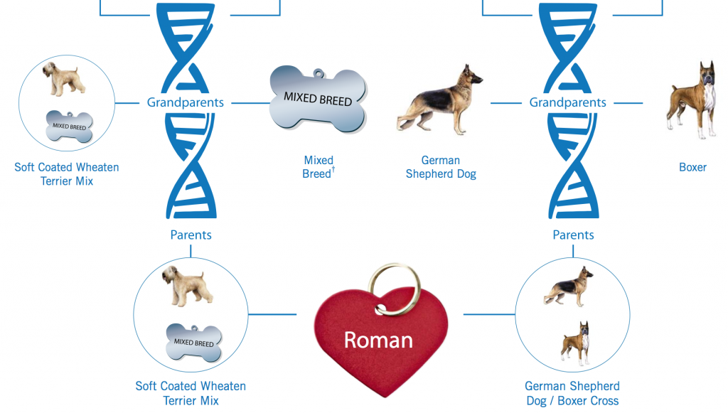 The test revealed that Roman is a bit of a mutt with his parents consisting of German Shepherd, Boxer, Soft Coated Wheaten Terrier and Mixed Breed: